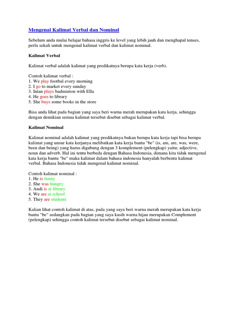 Contoh kalimat verbal dan nominal simple present tense. Kalimat nominal nominal sentence dan kalimat verbal verbal sentence juga merupakan salah satu dari pembagian kalimat tersebut.