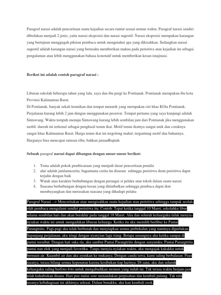 Paragraf narasi adalah jenis karangan yang memuat suatu cerita dengan runtutan waktu tertentu. Saya hanya di rumah saja dan melakukan kegiatan saya seperti biasa kecuali sepergi ke sekolah. Aku bangun pagi pagi sekali kemudian membantu ibu mempersiapkan perlengkapan yang akan dibawa. Liburan semester tahun lalu saya tidak berlibur kemana mana. Sudah sejak seminggu lalu orangtuaku berencana untuk liburan ke pantai mengingat aku dan adik sedang liburan sekolah sekaligus sebagai hadiah karena kemaren lusa adikku merayakan ulang tahun. Di sini contoh karangan narasi wawancara.