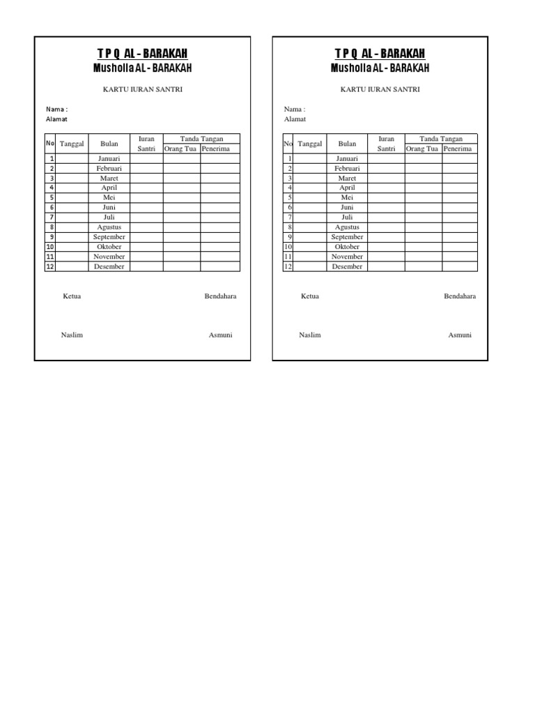Kartu iuran bulanan atau kartu spp adalah kartu yang digunakan untuk pencatatan pembayaran peserta didik kepada pihak sekolah yang biasanya dipegang oleh orang tua peserta didik. Berikut adalah contoh gambar kartu spp syahriah bagi lembaga taman pendidikan al quran dimana dibuat berdasarkan dua tahun ajaran baru. Berikut adalah contoh format kartu iuran bulanan untuk paud dan tk yang bisa digunakan dan diedit dengan mudah sesuai kebutuhan masing masing sekolah. Percayakan urusan cetak mencetak kartu iuran setoran angsuran spp kartu pasien anda kepada kami. Kalender syamsiyahmasehi yang dimulai dengan bulan juli dan kalender pendidikan secara hijriyah yang dimulai pada bulan syawal. Kartu prestasi tpa beserta hafalan.