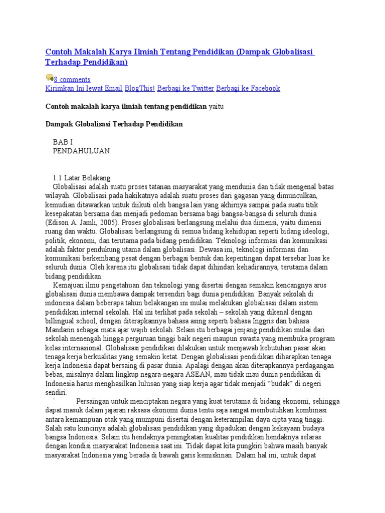 Karya tulis ilmiah dampak globalisasi terhadap pendidikan disusun. Anda bisa download melalui link di atas. Contoh karya ilmiah tentang pendidikan sobat pembaca blog kajian teori kali ini saya ingin berbagi mengenai contoh karya ilmiah tentang pendidikan setelah yang lalu sudah membahas tentang pengertian karya ilmiahpenulisan karya ilmiah memang harus dipahami oleh para insan pendidikan karena dengan adanya karya ilmiah kita menjadi kritis terhadap sesuatu terutama tentang. Contoh karya ilmiah tentang pendidikan sobat pembaca blog kajian teori kali ini saya ingin berbagi mengenai contoh karya ilmiah tentang pendidikan setelah yang lalu sudah membahas tentang pengertian karya ilmiahpenulisan karya ilmiah memang harus dipahami oleh para insan pendidikan karena dengan adanya karya ilmiah kita menjadi kritis terhadap sesuatu terutama tentang. Pengertian struktur dan ciri ciri karya tulis ilmiah. Contoh karya ilmiah tentang sampah.