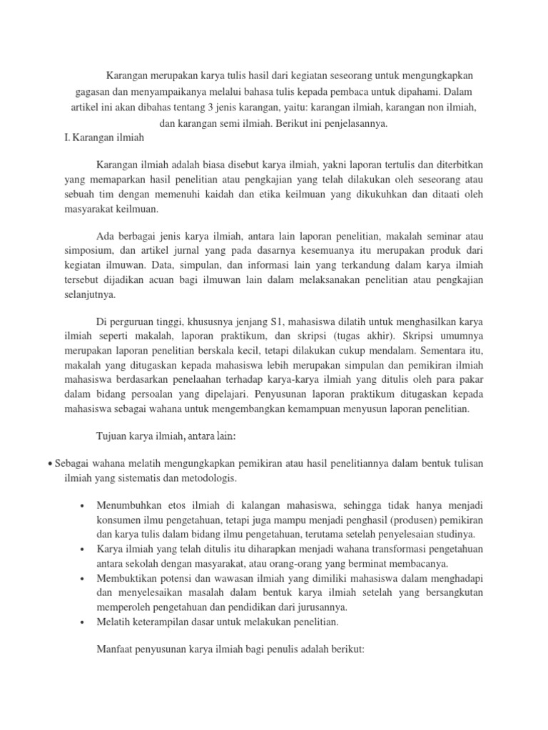 Contoh karya tulis non ilmiah. Karya tulis ilmiah semi ilmiah non ilmiah dan contoh karangan ilmiah ada berbagai jenis karya ilmiah antara lain laporan penelitian makalah seminar atau simposium dan artikel jurnal yang pada dasarnya kesemuanya itu merupakan produk dari kegiatan ilmuwan. Karya tulis ilmiah apakah kalian pernah membaca karya tulis ilmiah atau pernah membuatnya. Adalah laporan tertulis yang berisi hasil sebuah kegiatan ilmiah yang dilakukan peneliti. Pas banget buat kamu yang butuh referensi. Contoh karya tulis non ilmiah karya tulis non ilmiah adalah esai yang menyajikan fakta fakta pribadi tentang pengetahuan dan pengalaman dalam kehidupan sehari hari bersifat subyektif tidak didukung oleh fakta fakta umum dan biasanya menggunakan gaya bahasa populer atau yang umum digunakan tidak terlalu formal. Scientific paper adalah laporan tertulis dan diterbitkan yang memaparkan hasil penelitian atau pengkajian yang telah dilakukan oleh seseorang atau sebuah tim dengan memenuhi kaidah dan etika keilmuan yang dikukuhkan dan ditaati oleh masyarakat keilmuan.