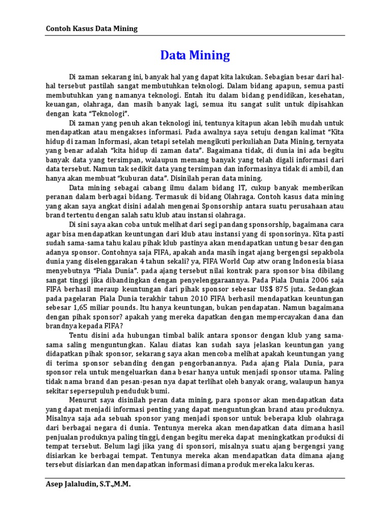Contoh kasus data mining dan penyelesaiannya. Gramedia pembuatan perangkat lunak data mining untuk penggalian kaidah asosiasi menggunakan metode apriori. Inilah pembahasan selengkapnya mengenai contoh soal statistik inferensial dan penyelesaiannya. Dalam kasus hit sengaja menambahkan zat diklorvos untuk membunuh serangga padahal bila dilihat dari segi kesehatan manusia zat tersebut bila dihisap oleh saluran pernafasan dapat menimbulkan kanker hati dan lambung. Contoh ini akan digunakan sebagai cara untuk menggambarkan sebuah kegiatan prediksi data mining bagaimana hubungan sebab akibat jarak dan waktu tempuh pengantaran jasa laundry. Penerapan metode data mining market basket analysisterhadap data penjualan produk buku dengan menggunakan algoritma apriori dan frequent pattern growthfp growth. Anda diminta membantu manager marketing tersebut untuk membuat model dengan menggunakan decision tree.