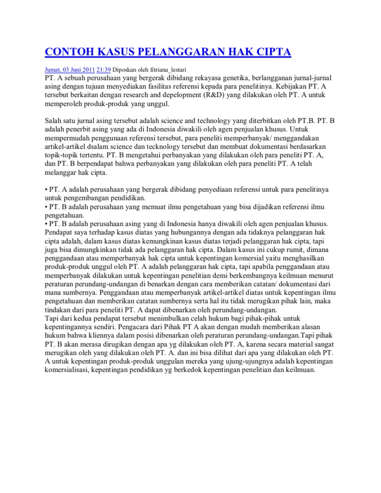 4 contoh kasus pelanggaran hak cipta film yang pernah terjadi di indonesia beberapa contoh kejadian yang kerap terjadi di dalam industri perfilman kita simak selengkapnya dalam artikel berikut ini. 1 pentingnya perlindungan karya cipta perlindungan hak cipta sangat terkait dengan kepentingan aspek sosial dan. Jika hak cipta diberikan secara otomatis kepada siapa yang pertama kali mendaklarasikan sedangkan hak paten diberikan kepada siapa yang pertama kali mendaftarkan teknologi tersebut. Kasus pelanggaran hak cipta pernah menyeret istri chrisye gusti firoza damayanti ke meja hijau. Dari contoh kasus hak cipta diatas bahwa perusahaan cayman music mengklaim lagu lagu itu tidak masuk ke dalam perjanjian ketika cayman music menjual sebagian hak haknya pada 1992 ke blue mountain music karena bob marley menulis lagu lagu tersebut dengan menggunakan nama orang lain. Namun sebelumnya akan saya terangkan dulu pentingnya perlindungan hak cipta jenis jenis pelanggaran dan sanksi pelanggaran pelanggaran hak cipta.
