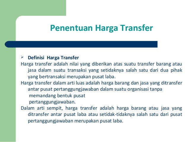 Harga ceramic glaze pada tahun 1997 adalah usd 830 per ton sedangkan mulai tahun 1998 sampai tahun 2001 harga terus menurun menjadi usd 570 per ton dan cenderung terus menurun di tahun 2002. Setiap harga transfer akan menjadi biaya variable bagi divisi pembeli meskipun dari sudut pandang perusahaan secara keseluruhan harga transfer tersebut mengandung unsur biaya tetap dari divisi penjual à jika manajer divisi pembeli melakukan perencanaan laba jangka pendek à usaha optimasi laba jangka pendek yang dilakukan oleh divisi pembeli tidak selalu berakibat optimasi laba perusahaan. Belakangan ini transfer pricing lebih banyak digunakan untuk tujuan perencanaan pajak daripada. Toyota direktorat jenderal pajak mencurigai adanya praktik transfer pricing yang dilakukan oleh pt. Maka jika divisi penjualan ada kapasitas penuh harga transfer tidak lebih dari harga pasar kalau tidak divisi penjual akan rugi dan begitu juga perusahaan secara keseluruhan. Transfer pricing definition atau pengertian transfer pricing adalah harga yang timbul ketika terjadi transaksi pertukaran barang dan jasa antar bagian atau anak perusahaan dalam satu grup.