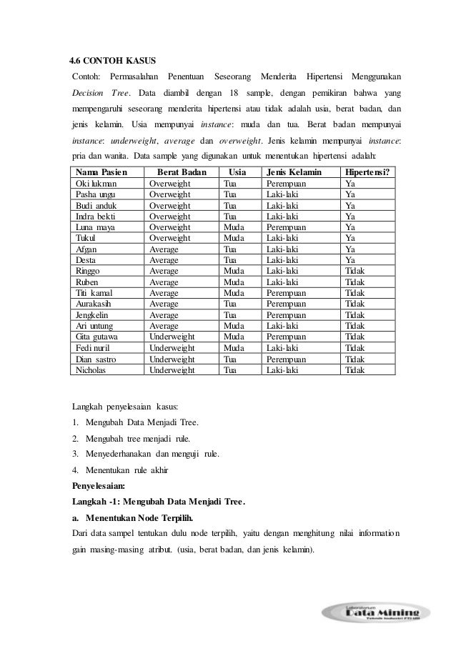 Contoh kasus klasifikasi data mining. Data mining oleh dosen pendidikan 3 diposting pada 11042020 metode data mining pengertian menurut para ahli sejarah jenis langkah teknik proses contoh untuk pembahasan kali ini kami akan mengulas mengenai data mining yang dimana dalam hal. Mengenal metode klasifikasi secara sederhana algoritma klasifikasi pada data mining merupakan sebuah catatan record data hendak diklasifikasikan kedalam salah satu dari sekian klasifikasi data yang tersedia pada variabel tujuan berdasarkan nilai nilai variabel prediktor. Karena kasus di atas adalah contoh belaka dengan jumlah atribut dan tuple yang tidak banyak maka metode coba coba untuk pemilihan node kedua di atas hanya untuk memberikan ilustrasi solusi dari kasus di atas. Apotik rumah sakit estomihi medan 5. Pengertian metode fungsi tujuan proses software penerapan arsitektur contoh data mining. Berikut beberapa contoh bidang penerapan data mining.