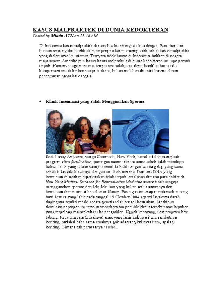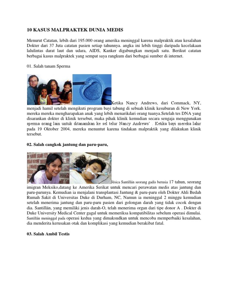 Kali ini terjadi di rumah sakit islam rsi surabaya. Seperti yang diungkapkan dalam laman departemen kesehatan yang berbunyi hingga maret 2011 mkdi telah menangani 127 pengaduan kasus pelanggaran disiplin yang dilakukan dokter atau dokter. Director of public prosecutions 1946 dan amerika serikat dalam kasus iran hostages crisis 1979 1980. Contoh kasus malpraktek dan penyelesaiannya. Melakukan malpraktik yuridis melanggar hukum berarti juga melakukan malpraktek etik melanggar kode etik. Dari angka tersebut sekitar 80 persen disebabkan kurangnya komunikasi antara dokter dan pasien.