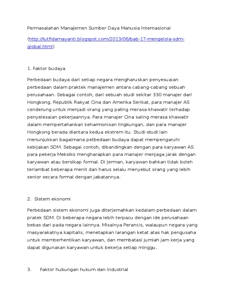 Contoh kasus manajemen sumber daya manusia tentang ekspatriat by rendireynaldi in. Faktor faktor eksternal yang yang utama yang mempengaruhi msdm global adalah tipe pemerintah keadaan ekonomi dan praktik praktik ketenagakerjaan di tiap negara berbeda beda. Hal ini disebabkan karena kewenangan untuk menyelenggarakan program program pelatihan dan pengalokasian sdm dipegang sepenuhnya oleh kantor pusat. Makalah contoh kasus manajemen sumber daya manusia pada perusahaan pt garuda indonesia persero tbk. Permasalahan manajemen sumber daya manusia internasional. Faktor faktor eksternal yang yang utama yang mempengaruhi msdm global adalah tipe pemerintah keadaan ekonomi dan praktik praktik ketenagakerjaan di tiap negara berbeda beda.