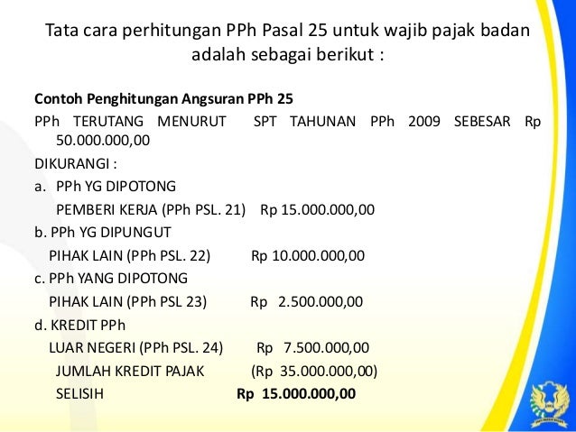 Pertama badan usaha yang memiliki pendapatan bruto sampai rp48 miliar per tahun atau sering disebut usaha mikro kecil dan menengah umkm berdasarkan peraturan pemerintah nomor 23 tahun 2018 dikenakan tarif pajak pph final yaitu pph pasal 4 ayat 2 dengan perhitungan pajak 05 dikalikan dengan seluruh pendapatan bruto dari hasil usaha. Badan usaha yang memiliki pendapatan bruto sampai 48 milyar per tahun dikenakan tarif pajak pph final yaitu pph pasal 4 ayat 2 dengan perhitungan pajak yaitu 1 dikalikan dengan seluruh pendapatan bruto dari hasil usaha perseroan dan berdasarkan pp 46 tahun 2013 maka wajib pajak atau badan usaha wajib menyetorkan pajak pph tersebut setiap bulan paling lambat tanggal 15. Hitunglah pph pasal 26 dari pt abadi berkarya tahun 2015. Tarif pph pasal 17 ayat 1 huruf b berdasarkan pasal 17 ayat 1 huruf b undang undang pajak penghasilan nomor 36 tahun 2008 bahwa wajib pajak badan dalam negeri dan bentuk usaha tetap adalah sebesar 28 dua puluh delapan persen. Tarif cara perhitungan dan pelaporannya. Untuk tahun pajak 2010 diatur pada pasal 17 ayat 2a menjadi 25.