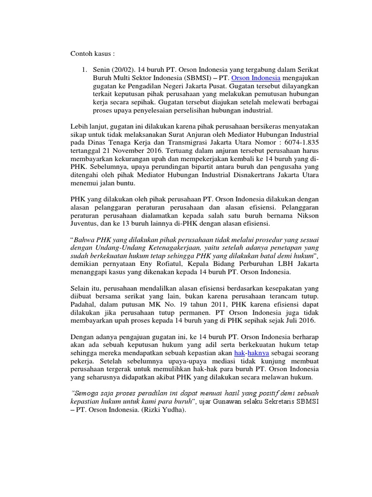 Contoh kasus perselisihan hubungan industrial. Padahal ini tidak termasuk dalam 4 jenis perselisihan hubungan industrial yang harus diselesaikan di pengadilan. Perselisihan hubungan industrial adalah perbedaan pendapat yang mengakibatkan pertentangan antara pengusaha atau gabungan pengusaha dengan pekerjaburuh atau serikat pekerjaserikat buruh karena adanya perselisihan mengenai hak perselisihan kepentinganperselisihan pemutusan hubungan kerja dan perselisihan antar serikat pekerjaserikat buruh dalam satu perusahaan pasal 1 angka 1 uu no. Penyelesaian hubungan industrial diatur dalam undang undang nomor 2 tahun 2004 tentang penyelesaian perselisihan hubungan industrial uu phiyang dimaksud dengan perselisihan hubungan industrial adalah perbedaaan pendapat yang mengakibatkan pertentangan antara pengusaha atau gabungan pengusaha dengan pekerjaburuh atau serikat pekerjaserikat buruh karena adanya perselisihan mengenai. Perselisihan hubungan industrial undang undang nomor 2 tahun 2004 tentang penyelesaian hubungan industrial uu phi dalam pasal 1 angka 1 memberikan definisi perselisihan hubungan industrial sebagai berikut. Dalam surat gugatan ke pengadilan hubungan industrial phi jakarta francois menjelaskan ia dipekerjakan oleh sis sejak 1 juli 2006 hingga 31 mei 2008 alias 23 bulan. Lewat kantor hukum adams co francois menggugat sis.