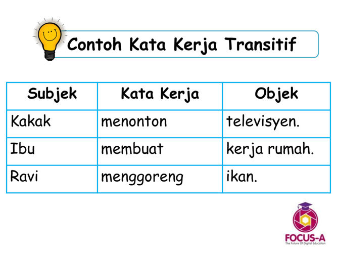 Kata ibu sebagai subjek aktor memasak sebagai verba materialnya dan nasi adalah sebagai objek sasaran. Contoh kalimat kata kerja material ibu memasak nasi kata ibu aktor subjek memasak verba material nasi sasaran kata kerja relasional kata kerja ini lebih menjurus pada kata kerja yang berfungsi sebagai penghubung antara.