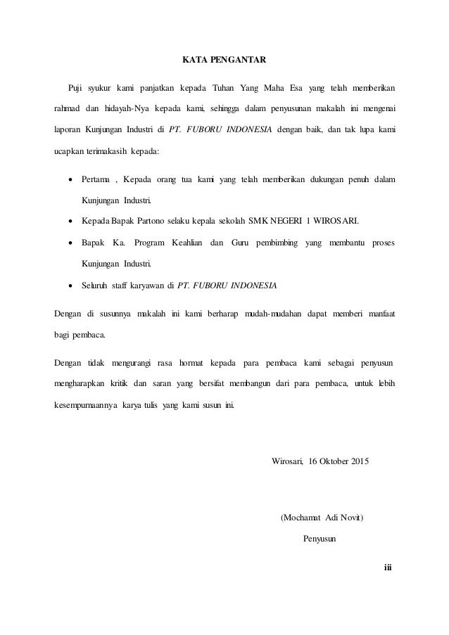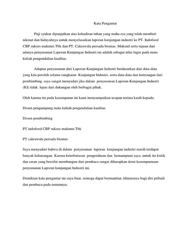 Contoh kata pengantar laporan kunjungan industri. Sayangnya penulisan kata pengantar kadang dipandang sebelah mata dan dianggap spele bahkan dalam pembuatannya banyak yang masih asal asalan. Tema laporan kunjungan industri. Penulis sudah berhasil menyelesaikan laporan kunjungan industri ke pt. Contoh kata pengantar laporan bagi mahasiswa dan pelajar membuat kata pengantar untuk tugas laporan adalah hal yang sangat penting. Sehingga penulis telah menyelesaikan laporan kunjungan industri ke pt yakult persada ini secara tepat waktu. Contoh kata pengantar makalah.