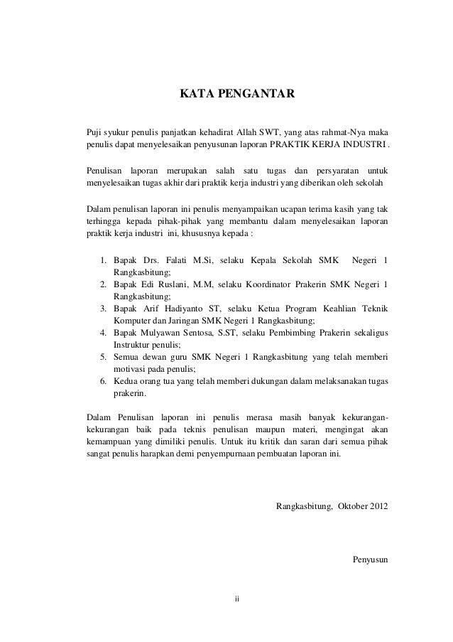 Contoh kata pengantar laporan pkl mahasiswa. Contoh kata pengantar kali ini khusus untuk laporan prakerin atau pkl praktek kerja lapangan. Jangan khawatir bro sis disini badrul mozila akan. Berikut ini saya kami akan berikan beberapa contoh kata pengantar prakerin yang baik dan benar sesuai dengan sistematika penulisan karya ilmiah. Kata pengantar puji syukur penulis ucapkan kehadirat tuhan yang maha esa yang telah melimpahkan rahmat dan hidayah nya sehingga dapat menyelesaikan penyusunan laporan praktik kerja industri di pt. Bagi siswa maupun mahasiswa ketika hendak membuat laporan apakah itu untuk pkl tugas akhir maupun keperluan yang lainnya mereka tentu sudah paham bahwa laporan tersebut harus memiliki kata pengantar. Contoh kata pengantar laporan bagi mahasiswa dan pelajar membuat kata pengantar untuk tugas laporan adalah hal yang sangat penting.