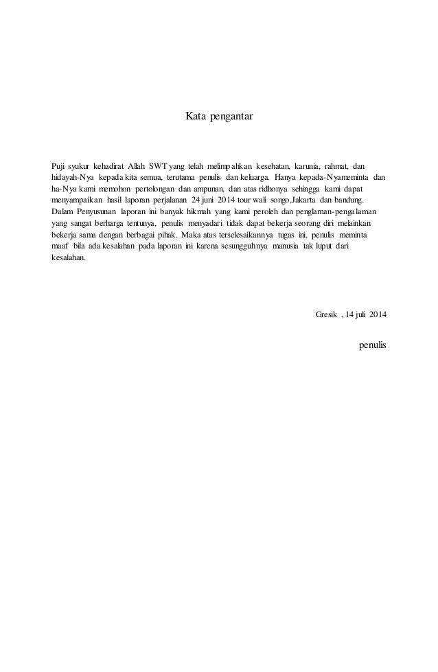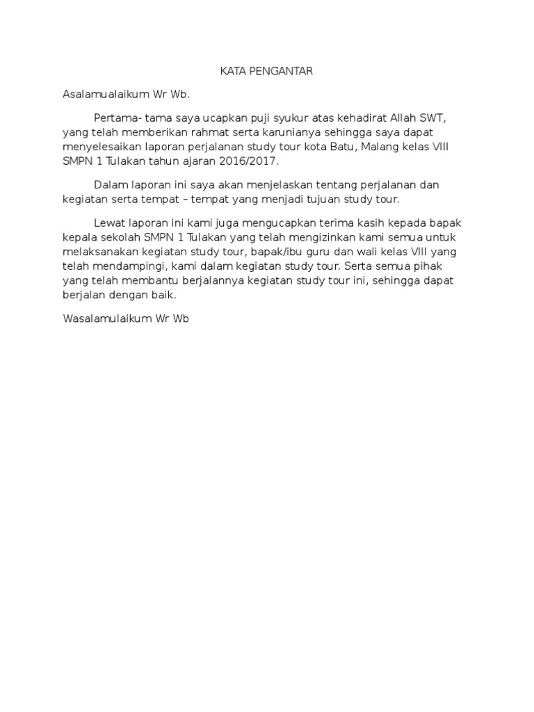 Kata pengantar puji syukur kami panjatkan kehadirat tuhan yang maha esa yang telah melimpahkan rahmat serta hidayahnya kepada kita semua sehingga kami dapat menyelesaikanlaporan studi wisata ini dan mudah mudahan laporan ini dapat bermanfaat bagi kita semua. Puji syukur kehadirat allah subhanahu wataala yang telah mempergantikan siang dan malam dengan sempurna sehingga kami dapat melaksanakan study tour dengan selamat tanpa ada halangan apapun. Contoh kata pengantar laporan laporan study tour kata pengantar puji syukur kami panjatkan kehadirat tuhan yang maha esa yang telah melimpahkan rahmat dan hidayah nya serta karunian nya sehingga kami dapat menyelesaikan karya tulis yang berjudul laporan kegiatan studi lapangan komprehensif ini dengan baik tanpa ada halangan.