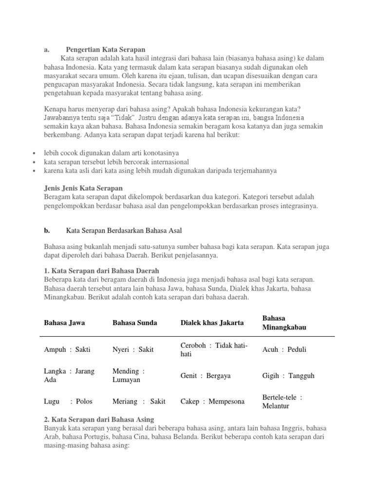 Bahasa daerah tersebut antara lain bahasa jawa bahasa sunda dialek khas jakarta bahasa minangkabau. Karena mengingat hingga kini bahasa indonesia masih tergolong bahasa yang baru dan berkembang. Karena itu penggunaan bahasa indonesia pun tak luput dari kata serapan yang berasal dari bahasa daerah. Beberapa kata dari beragam daerah di indonesia juga menjadi bahasa asal bagi kata serapan. Contoh kata serapan kata serapan adalah kata yang diserap dari bahasa lainterdapat beberapa kata serapan dari bahasa asing dan bahasa daerah yang digunakan di indonesia misalnya kata serapan dari bahasa inggris arab belanda portugis china jepang hindi persia dan sebagainya. Tanah di depan gang tersebut amblas tanpa diketahui.