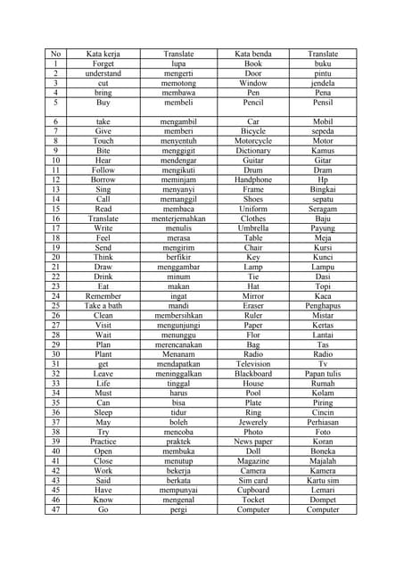 Kata kerja bahasa inggris adalah kumpulan regular dan irregular verb beserta artinya. Dengan mempelajari idiom dalam bahasa inggris biasanya kemampuan seseorang untuk berkomunikasi akan meningkat karena mengerti berbagai cara mendeskripsikan sesuatu dengan tepat.