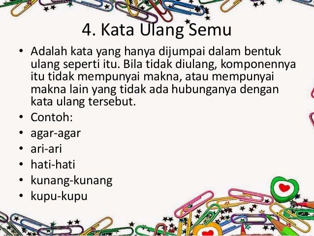Definisi dan contoh kata ulang kata ulang adalah kata yang tereduplikasi artinya kata tersebut mengalami pengulangan dengan maksud dan tujuan tertentu. Berjalan berjalan jalan memukul memukul mukul berlari berlari lari sama sesama tangga tetangga berapa beberapa. Kata ulang berimbuhan kata ulang berimbuhan atau kata ulang sebagian yaitu bentuk pengulangan kata dengan mendapat awalan sisipan akhiran atau gabungan imbuhan sebelum atau sesudah kata dasarnya diulang. Menurut waridah dkk 2015278 kata ulang semu adalah kata ulang yang tidak mempunyai arti jika berdiri sendiri. Kata ulang utuh penuh seluruh contoh. Proses pembentukan pengulangan kata dapat terjadi dengan berbagai cara.