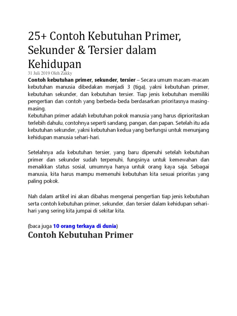 Dalam kehidupan sehari hari manusia harus memenuhi kebutuhan hidupnya demi keberlangsungan hidupnya. Nah itulah contoh contoh kebutuhan sekunder dalam kehidupan sehari hari manusia. Contoh kebutuhan primer yang utama adalah sandang pakaian pangan makan dan papan rumah. Salah satu ciri kebutuhan tersier ditandai dengan adanya keinginan seseorang untuk mendapat pengakuan kemampuan finansial dirinya dari orang lain. Nah itu tadi beberapa contoh kebutuhan pokok manusia sehari hari yang harus dipenuhi. Selain itu juga ada contoh kebutuhan primer lain yang dibutuhkan manusia dalam kehidupan.