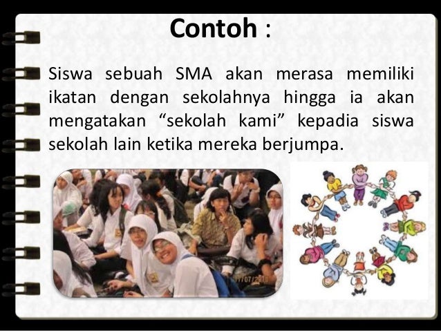 Contoh kelompok in group. Sejak lahir setiap orang telah menjadi bagian atau anggota dari kelompok sosial tertentu. In group adalah kelompok sosial yang individunya mengidentifikasinya dirinya dalam kelompok tersebut. Sebagai contoh seperti seseorang yang lahir di jawa dan hidup serta tumbuh di jawa maka orang tersebut secara otomatis akan menjadi anggota kelompok masyarakat jawa. Paguyuban masyarakat cirebon contoh lainnya mengenai kelompok sosial dalam masyarakat adalah paguyubanan cirebon. Pengertian contoh dan ciri ciri kelompok sosial di masyarakat atau disekitar kita banyak kita temui kelompok kelompok atau komunitas sosial dimana kelompok sosial ini biasanya memiliki nama sesuai dengan karakteristik atau ciri khas yang dimiliki oleh kelompok sosial tersebut. Ingroup kelompok dalam merupakan kelompok sosial di mana di antara anggota anggotanya saling simpati dan mempunyai perasaan dekat satu dengan lainnyakelompok sosial merupakan tempat di mana individu mengidentifikasikan dirinya sebagai kami atau kamu kita atau mereka.