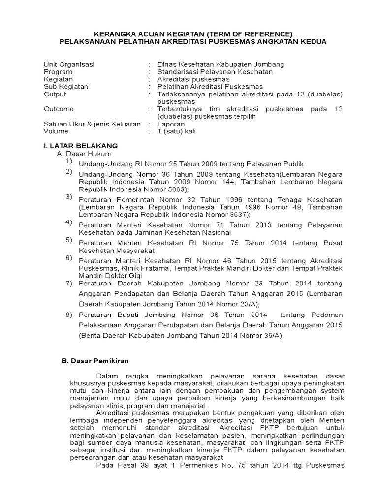 Contoh kerangka acuan kerja kegiatan pelatihan. Kerangka acuan kerja atau juga disebut term of reference tor pengadaan barang adalah suatu dokumen yang menginformasikan gambaran latar belakang tujuan ruang lingkup dan struktur sebuah proyek pengadaan barang yang telah disusun oleh skpddinas terkait. Peningkatan kompetensi sdm guru dan staf kegiatan. Kerangka acuan ke giatan kementerian negaralembaga. Badan pengembangan dan pemberdayaan sdm kesehatan program. Kerangka acuan kegiatan term of reference pertemuan koordinasi pengelola penyelenggara diknakes diklat dan masyarakat kementerian negara lembaga. Penutup demikian kerangka acuan kegiatan ini dibuat untuk dapat dipergunakan sebagai pedoman dalam pelaksanaan kegiatan.