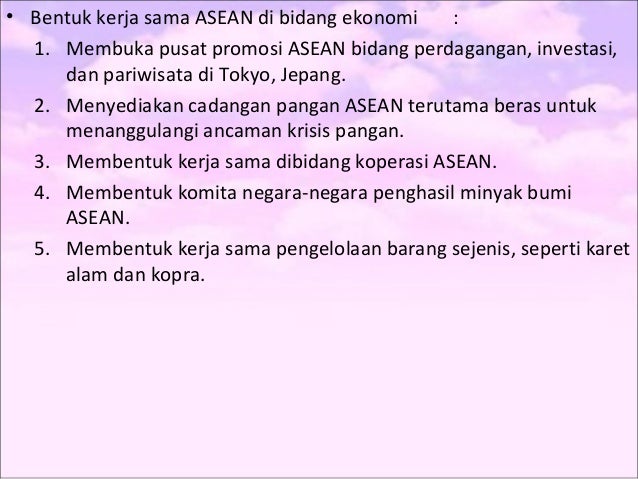 Contoh kerjasama asean di bidang ekonomi. Kerja sama asean di bidang ekonomi. Kerjasama asean di bidang sosial budaya sebagai perwujudan masyarakat asean merupakan salah satu pilar penting dalam berlangsungnya kerjasama antar negara anggota asean. Perlu kita ketahui semenjak asean didirikan kerjasama pada bidang ekonomi yang terjalin diantara negara negara anggota maupun negara bukan anggota sudah berjalan dengan baik. Adapun bentuk bentuk kerjasama asean dalam bidang ekonomi adalah sebagai berikut. Kerjasama dalam bidang politik dan keamanan dilakukan menggunakan instrumen politik seperti kawasan damai bebas dan netral zone of peace freedom and neutrality zopfan traktat persahabatan dan kerjasama treaty of amity and cooperation tac in southeast asia dan. Dalam ilmu ekonomi kerjasama asean adalah untuk membahas upaya anggota asean untuk mencipatakn perdagangan yang saling menguntungkan dan bentuk kerjasama di bidang ekonomi direalisasiakn asean dalam bentuk.