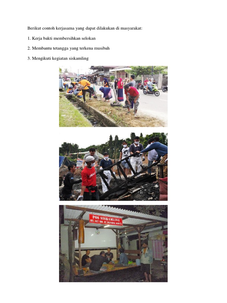 Kerjasama di lingkungan kelurahan dapat berupa kerja bakti membersihkan selokan dan lingkungan sekitarnya. Selain itu kerjasama dapat diartikan sebagai suatu tindakan di dalam pekerjaan yang dilakukan oleh 2 orang atau lebih untuk bisa mencapai tujuan demi keuntungan bersama. Contoh tpleransi negative ini adalah masyarakat indonesia membiarkan komunis dan ajarannya di zaman baru merdeka. Kerjasama merupakan sebuah pekerjaan yang dilakukan oleh 2 orang atau lebih agar dapat mencapai tujuan ataupun sasaran telah direncanakan dan disepakati secara bersama. Selain itu juga sebagai salah satu bentuk kerjasama antara lembaga sekolah dengan masyarakat sekitar yaitu di persimpangan jalan yang menuju kearah sekolah sd sudah disiapkan tim dari sekolah yaitu tim patroli keamanan sekolah pks yang tugasnya adalah mengatur lancarnya lalu lintas dijalan raya dan membantu menyebrangkan siswa yang akan menyebrang jalan. Dalam masyarakat kita kerjasama dikenal dengan istilah gotong royong.