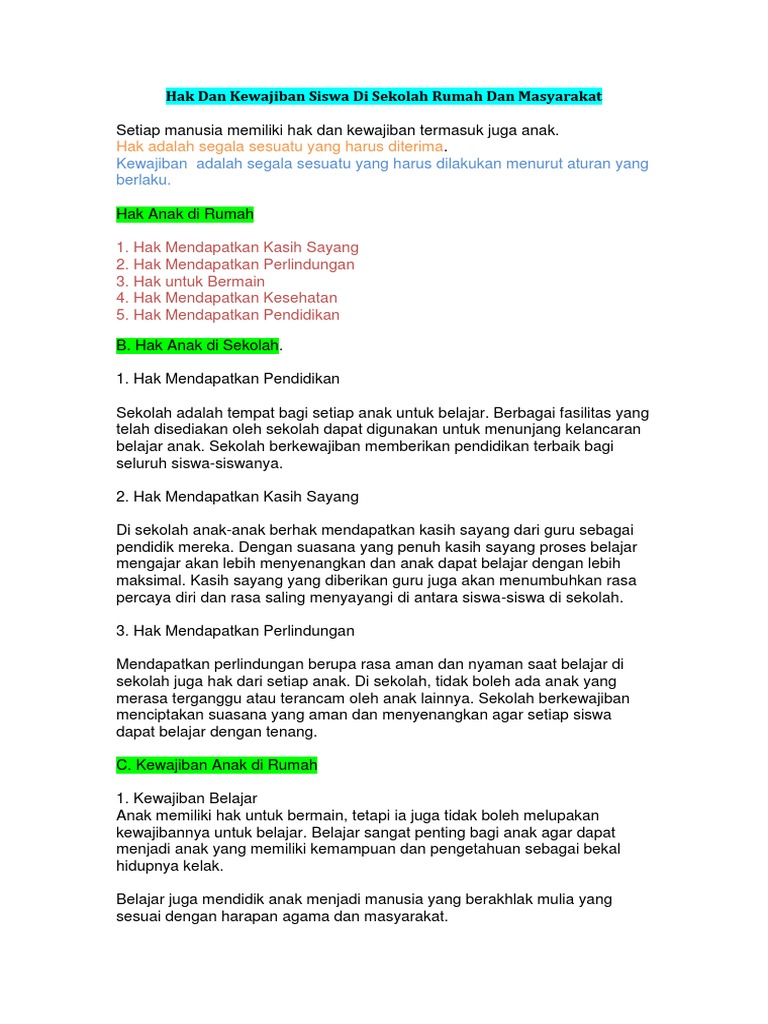 Setiap anak berhak untuk dicintai. Intinya sebagai anak anak kita harus tahu apa hak kewajiban kitasetidaknya kita tahu apa hak kewajiban kita di rumah dan di sekolah. Anak anak merupakan bagian dari warga masyarakat. Menghormati kedua orang tua 2. Kewajiban menjalankan perintah agama. Hak dan kewajiban di rumah marilah kita mulai dari hal yang sederhana.