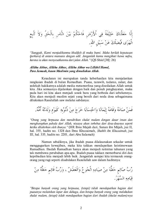 Contoh khutbah hari raya idul fitri adalah salah satu dari dua hari raya bagi umat islam di seluruh duniasetelah berpuasa selama sebulan penuh umat islam akan berhadapan dengan hari yang fitri yang maksudnya kembali ke fitrah suci di antara salah satu sunnah di hari idul fitri yaitu shalat sunnah id yang didalam pelaksanaannya juga terdapat khutbah. Menjaga hati tiga pesan ramadhan assalamualaikum warahmatullahi wa barakatuh.