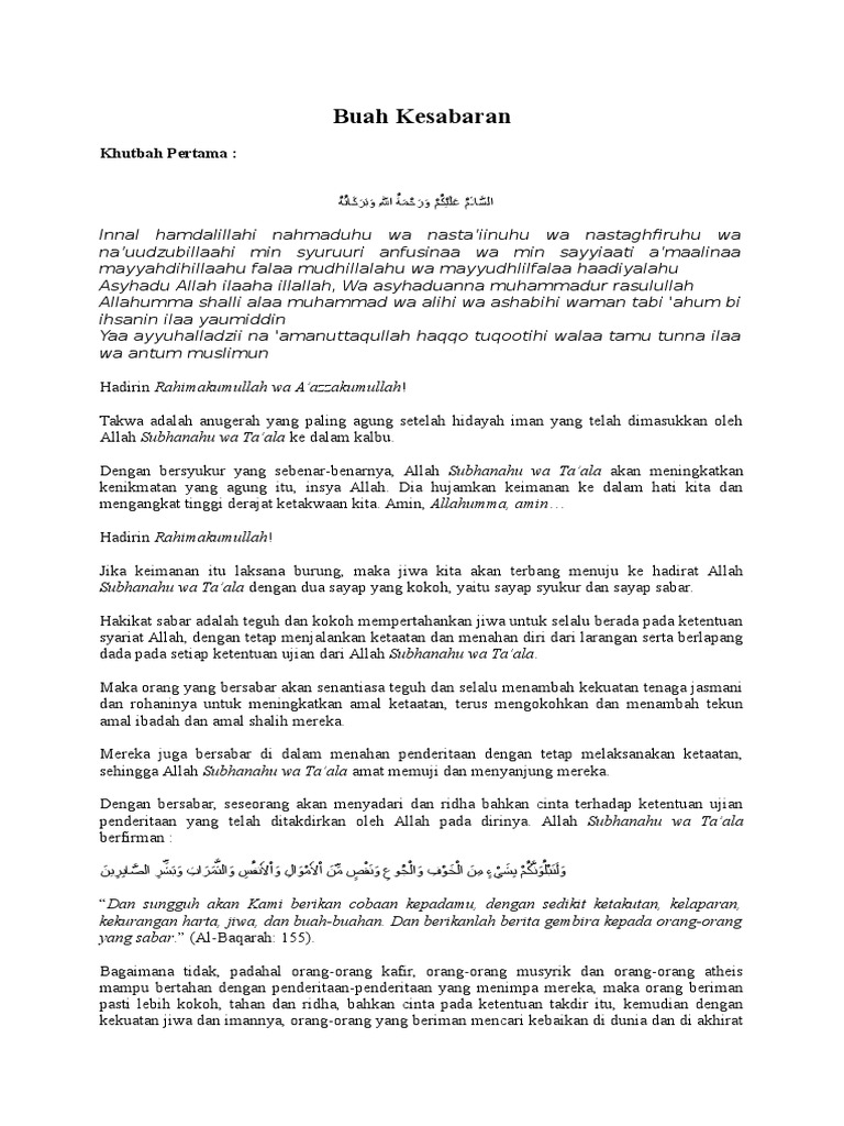 Sabar seperti inilah yang membuahkan kemenangan kemuliaan kebahagiaan keamanan dan tambahan kecintaan dari allah ﷻ dan manusia. Karena kemerdekaan memang tentang persoalan manusia secara keseluruhan. Teks khutbah jumat singkat padat dan jelas. Alhamdulillahirabbilalamin marilah kita ucapkan rasa syukur kepada allah swt karena telah memberi kita kesempatan untuk berkumpul di masjid besar ini untuk saling bersilaturahim. Sabar dan tawakkal memelihara agama teks khutbah jumat singkat padat dan jelas.