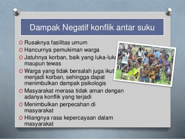 Contoh konflik antar suku. Konflik antar suku di papua nugini 24 orang tewas termasuk ibu hamil. Contoh konflik antar suku di indonesia. Konflik di lampung selatan. Ratusan orang madura juga ditemukan dipenggal oleh orang dayak. Konflik yang ada di negara indonesia ini mungkin sudah dianggap biasa karena dengan sering terjadinya konflik antar suku di dalam negara indonesia tercinta ini berikut beberapa contoh konflik antar suku yang terjadi di negara indonesia. Peperangan antar suku akhir akhir ini menjadi bahan pekerjaan pemerintah untuk menetralisir kekisruhan yang sering terjadi khususnya peperangan antar suku.
