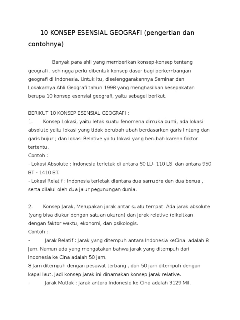 Dalam kehidupan sosial ekonomi jarak memiliki arti penting. Geografi adalah ilmu pengetahuan yang menggambarkan segala. Menurut hasil seminar lokakarya ikatan geografis indonesia semlok igi tahun 1988 di semarang konsep dasar geografis terdiri dari 10 bentuk antara lain. Konsep geografi adalah unsur penting dalam memahami fenomena ataupun kejadian geografi baik alam maupun sosial. Konsep dasar geografis ialah dasar penting untuk mengenali keadaan atau gejala geografis. Penjelasan konsep dasar geografi selalu berkaitan dengan persebaran hubungan fungsi bentuk pola dan proses terjadinya.