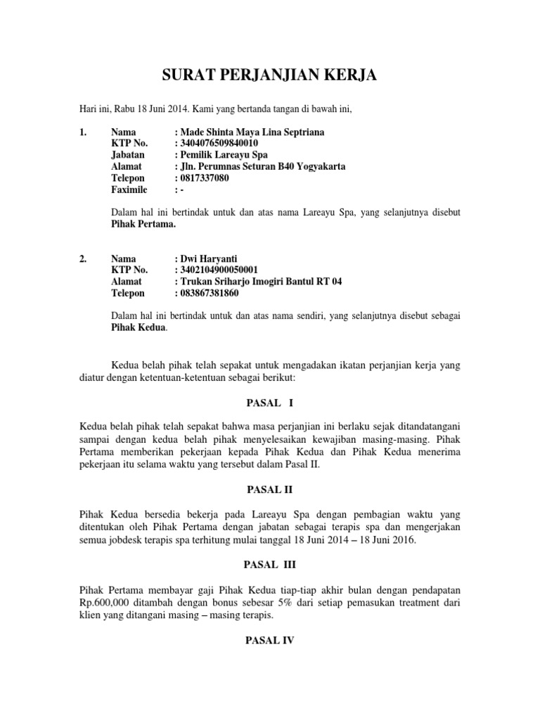 Dalam daftar isi silahkan pilih dan klik contoh surat yang diinginkan anda akan diarahkan ke link untuk mendownload surat tsb. Academiaedu is a platform for academics to share research papers. Contoh kontrak kerja karyawan ini sebenarnya sudah banyak digunakan oleh semua perusahaan. Download contoh surat perjanjian kerja doc. Perusahaan yang baik sudah pasti membuat kontrak kerja sesuai undang undang yang dibuat oleh pemerintah yaitu berdasarkan uu no13 tahun 2003 tentang ketenagakerjaan yang memuat syarat kerja hak dan. Contoh surat perjanjian kerja karyawan.