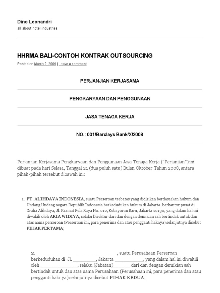 Simpan simpan contoh kontrak outsourcing dino leonandri untuk nanti. Contoh surat perjanjian kerja kontrak. Banyak contoh surat kontrak kerja yang berlaku dalam sebuah perusahaan. Unduh sebagai pdf txt atau baca online dari scribd. Sehingga anda perlu memerhatikannya dengan teliti mengenai kontrak kerja karyawan yang ingin anda buat. Contoh surat kontrak kerja surat kontrak kerja adalah salah satu dokumen penting yang dimiliki oleh seorang karyawan pegawai di sebuah perusahaan.