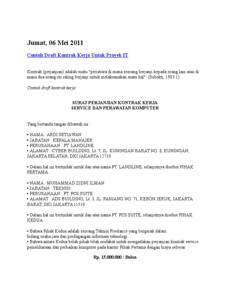 Software development dapat didetailkan lagi menjadi proses. Draft kontrak kerja proyek ti teknologi informasi kontrak perjanjian adalah suatu peristiwa dimana seseorang berjanji kepada ora. Itulah mengapa mengetahui cara pembuatan invoice tagihan khususnya pada. Memastikan bahwa proyek akan dibayar setelah pekerjaan selesai tentu sangat penting. Contoh draft kontrak kerja untuk proyek ti. 1 penciptaan software untuk memenuhi kebutuhan manusia 2 desain software 3 pengembangan software aplikasi perusahaan atau 4 pengembangan platform wales 2012.