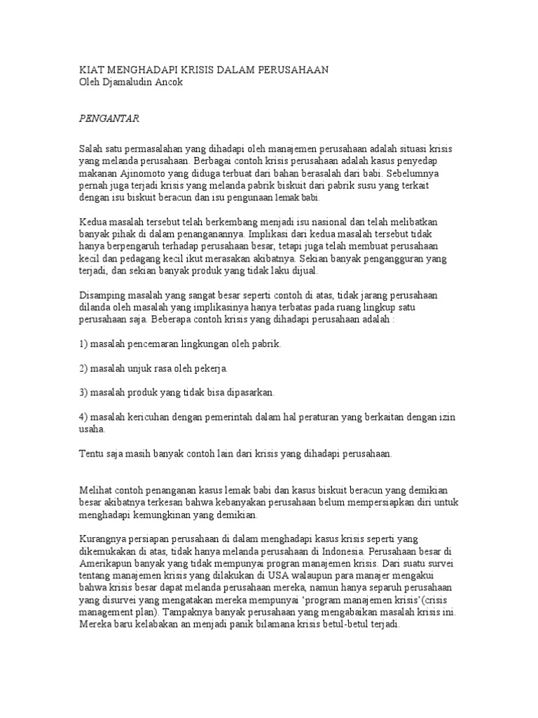 Ketika terjadi krisis maka tidak terhindarkan lagi kebutuhan komunikasi intens kita dengan media termasuk media sosial publik pelanggan dan stakeholders lainnya. Respon tylenol terhadap situasi tragis tahun 1982 di chicago ini menunjukkan betapa pentingnya kepentingan publik sehingga perusahaan mendapatkan respons yang sangat baik dari masyarakat. Krisis tidak terpecahkan dan jalan perusahaan menjadi kacau. Contoh kasus krisis perusahaan dan cara penanganannya on. Pasca krisis perusahaan memperkenalkan kembali tylenol dengan kemasan tamper dan memberikan kupon senilai us 250. Hamad 2016 menjelaskan krisis merupakan hal biasa terjadi tapi harus segera ditanggulangi agar tidak menimbulkan kerugian yang lebih besar lagi dan.