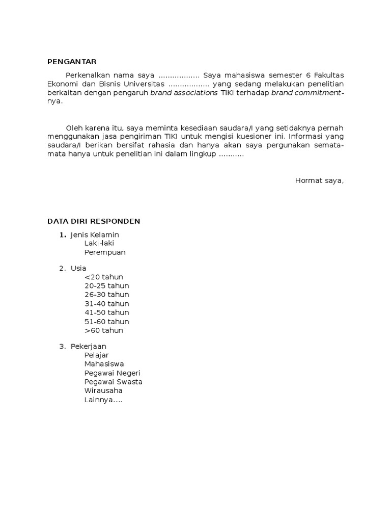 Contoh kuesioner citra merek. Identitas responden berikan tanda x pada jawaban anda. Kuesioner analisis perilaku konsumen terhadap keputusan pembelian sepatu merek converse dikota malang dengan hormat dalam kesempatan ini saya mohon bantuan dari bapakibusaudara untuk meluangkan waktu guna mengisi angket yang saya sertakan berikut ini. Samsung pada mahasiswa fakultas. Lampiran 1 kuesioner pengaruh harga kualitas produk dan citra merek terhadap keputusan pembelian kecap manis merek bango studi kasus para ibu rumah tangga di komplek villa mutiara johor ii dan taman johor mas bersama ini saya meminta kesediaan ibu untuk mengisi daftar kuesioner yang diberikan. Ketiga variable tersebut mempengaruhi secara positif terhadap minat beli. Contoh tesis 7.