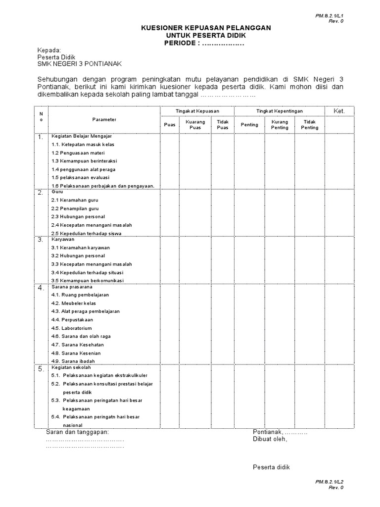 Aturlah bahasa dalam kuesioner sebaik dan semudah mungkin dipahami karena biasanya orang hanya membaca pertanyaan pertanyaan dalam kuesioner sacara cepat. Download kuesioner kepuasan pelanggan. Isilah kuesioner ini sesuai dengan kondisi yang terjadi pada rsud x. Pengaruh kualitas pelayanan terhadap kepuasan pelanggan. Jika seseorang ingin membuat kuesioner pastikan lah jika kuesioner tersebut telah disiapkan dengan sebaik baiknya. Buat kamu yang mau melakukan penelitian di bawah ini saya berikan contoh kuesioner penelitian oleh salah satu mahasiswa di suatu kampus.