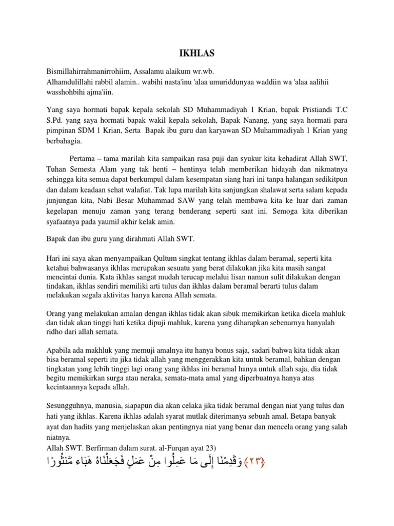Contoh kultum tentang ikhlas. Pencariankultum singkat tentang ikhlas materi kultum singkat yang menarik materi kultum singkat untuk pemula materi kultum singkat untuk remaja kultum singkat tentang ilmu. Ikhlas kata yang mudah diucapkan tapi sangat sulit untuk dilakukan. Untuk tata cara atau urut urutan dalam menyampaikan kultum singkat bisa dibaca lagi pembahasan yang ada di atas tadi. Kultum singkat tentang ikhlas ikhlas dalam agama islam mempunyai kedudukan yang penting ia nya merupakan pondasi dan ruh suatu amal ibadah. Sebab ikhlas adalah suatu amaliyah hati yag bisa masuk. Secara bahasa sabar berasal dari kata bahasa arab shobaro yang berarti menahan.