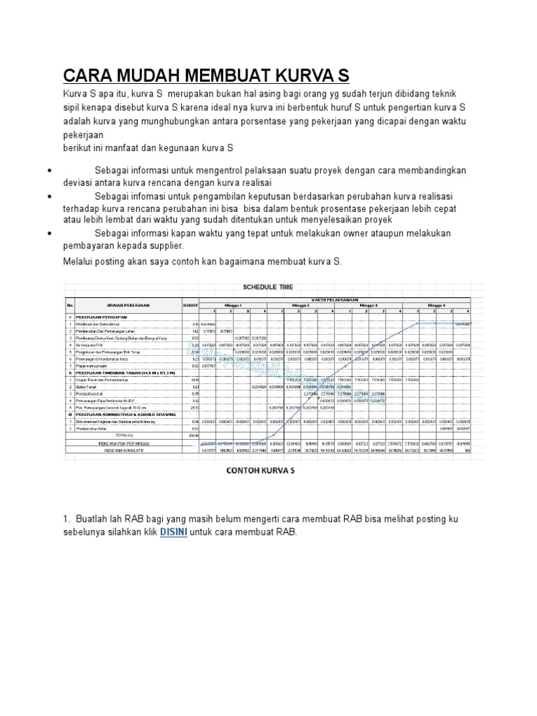 Contoh kurva s rencana dan realisasi. Pada artikel kali ini saya akan memaparkan cara membuat time schedule tersebut beserta barchart dan kurva s nyakarena pada dasarnya ke 3 data tersebut disajikan dalam 1 lembar produk yang sama. Project excel bentuk network planing dan beberapa fitur lain yang saat ini banyak beredar namun pada umumnya pembuatan kurva s atau jadwal pelaksanaan pekerjaan lebih sering menggunakan microsoft excel disamping lebih mudah praktis dan lebih cepat. Contoh rencana anggaran biayatime schedule dan kurva s pada proyek bangunan akan saya bagikan kepada andakarena akhir akhir ini saya mendapatkan tugas untuk membuat itu dan sampai sekarang belum selesai juga karena saya agak kurang mengerti cara membuatnya jadi saya post aja disini hasil temuan saya di google. Cara membuat kurva s dalam dunia konstruksi tidak pernah lepas dari perhitungan. Kurva s ini secara gampang akan terdiri atas dua grafik yaitu grafik yang merupakan rencana dan grafik yang merupakan realisasi pelaksanaan. Kurva s dipakai untuk melihat progress pekerjaan harian mingguan dan bulan.