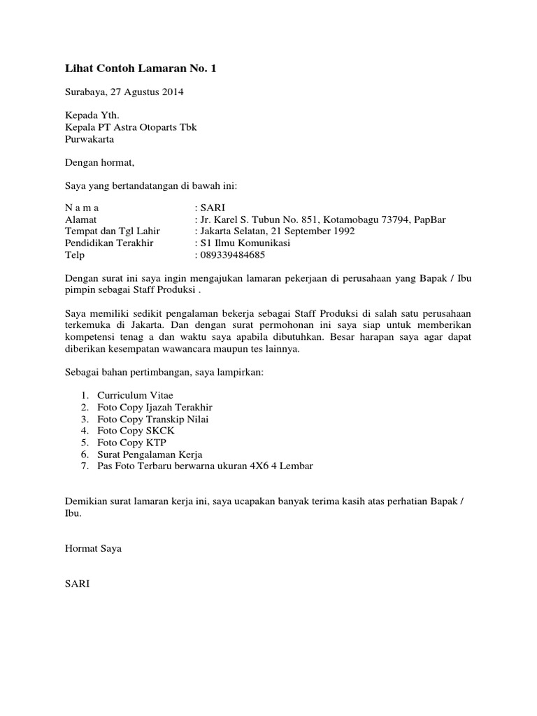 Contoh surat lamaran kerja di pt. Contoh surat lamaran kerja di perusahaan seringkali dicari oleh para pencari kerja yang ingin mengajukan lamaran pekerjaan di perusahaan perusahaan yang ada di indonesia. Contoh surat lamaran kerja berikut contoh surat lamaran pekerjaan yang bisa kamu download file dokumennya. Bandung 12 desember 2015 kepada yth. Dengan hormat berdasarkan iklan yang dimuat di harian kompas kemarin tanggal 4 september 2019 bahwa bapakibu sedang membuka lowongan pekerjaan untuk menempati posisi sebagai. Surat lamaran kerja dibutuhkan guna melamar pekerjaan baru untuk kamu yang baru lulus kuliah pindah kerja cari suasana baru maupun fresh graduate.