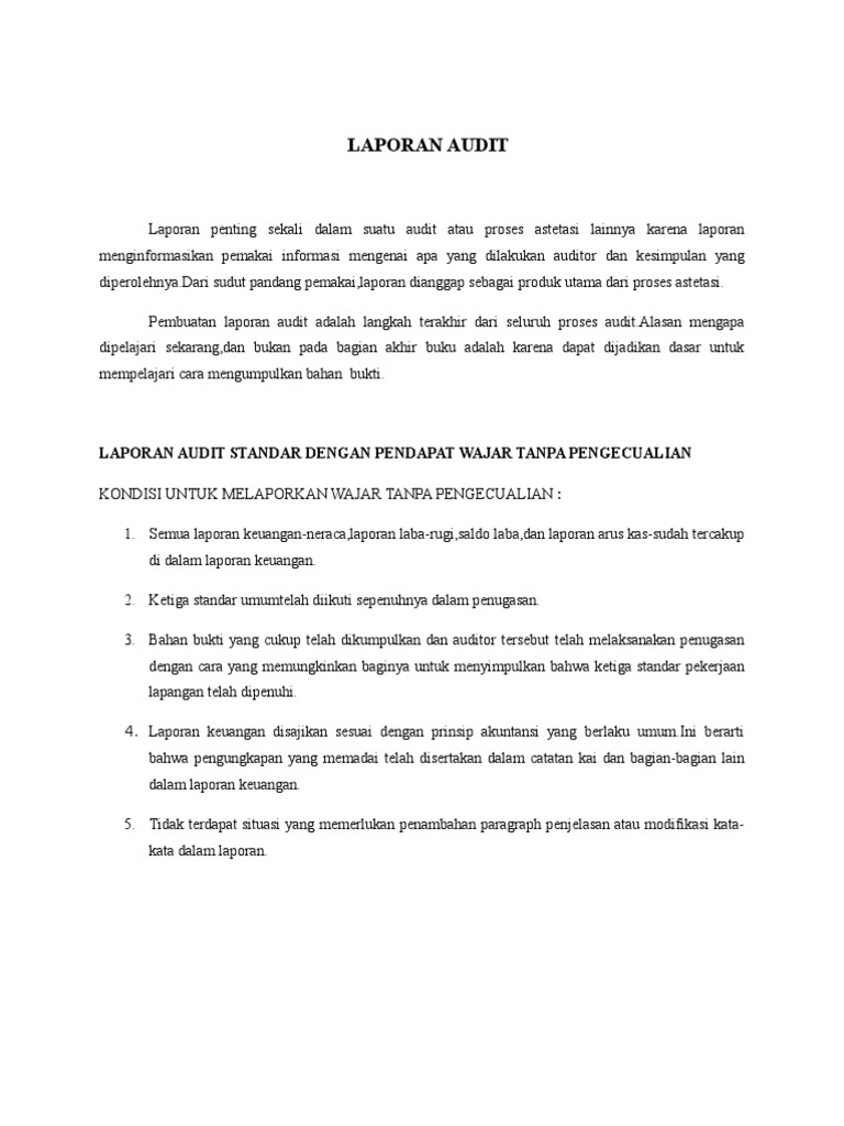 Laporan audit independen kepada yth. Direksi dan dewan komisaris pt. Maka dari itu sebagai dasar atas pemberian opini wajar tanpa pengecualian auditor harus menerima serta memberikan uraian dan penjelasan dalam paragraf terpisah mengenai kemungkinan adanya misleading sebagai akibat dari ketidaksesuaian penyusunan laporan keuangan dengan standar akuntansi yang berlaku umum tersebut. Inilah informasi yang dapat kami sampaikan contoh laporan audit wajar tanpa pengecualian dengan paragraf penjelas. Laporan auditor independen laporan no. Opini wajar dengan pengecualian qualified opinion dalam opini ini auditor akan memberikan pendapat bahwa secara umum laporan audit dan keuangan yang disajikan sudah wajar.