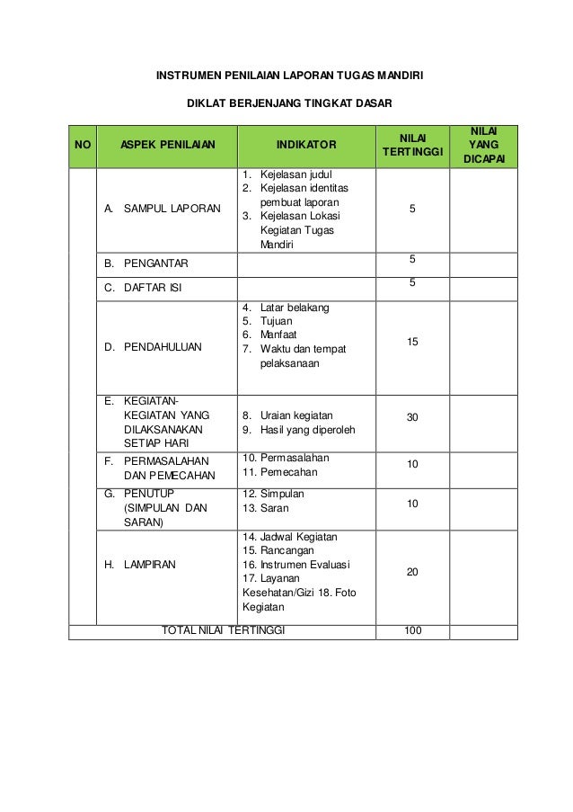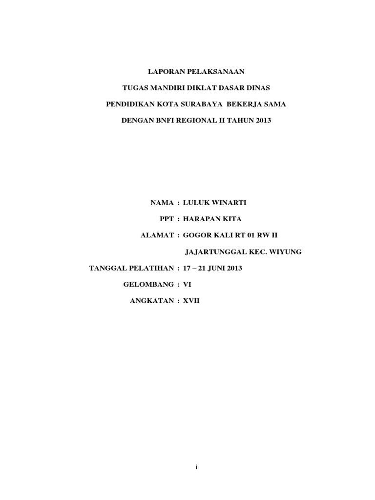 Laporan akhir tugas mandiri diklat berjenjang paud tk tingkat dasar 2014 1. Softgaleri adalah blog yang berbagi informasi download contoh soal soal uts kelas 1 2 3 4 5 6 sdmi siap cetak. Laporan tugas mandiri diklat berjenjang tingkat dasar bagi pendidik paud kabupaten purbalingga tahun 2014 erlina nama traning provider. Makalah pengaruh keluarga miskin terhadap perkembangan fisik motorik anak 1. 21 oktober 15 november. Contoh tugas laporan diklat dasar berjenjang 14.