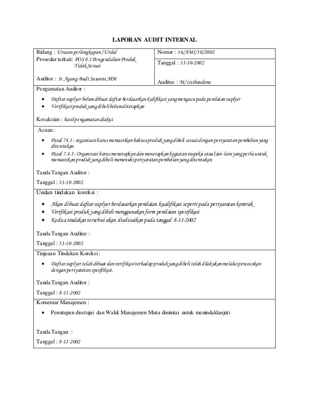 Contoh laporan hasil audit mutu internal. Laporan audit mutu internal harus memuat. Samsul arifin berdasarkan daftar nilai dari dosen adalah b tetapi pada rekapitulasi dan. Demikian pembahasan mengenai hasil temuan audit dan contoh laporan hasil audit internal perusahaan. Berdasarkan hasil audit yang tercantum dalam tabel 4 temuan umum unit kerja non prodi pada audit bulan agustus 2015 ini terdapat 10 temuan. Isi laporan audit mutu internal 1. Maksud tujuan dan ruang lingkup audit 3.