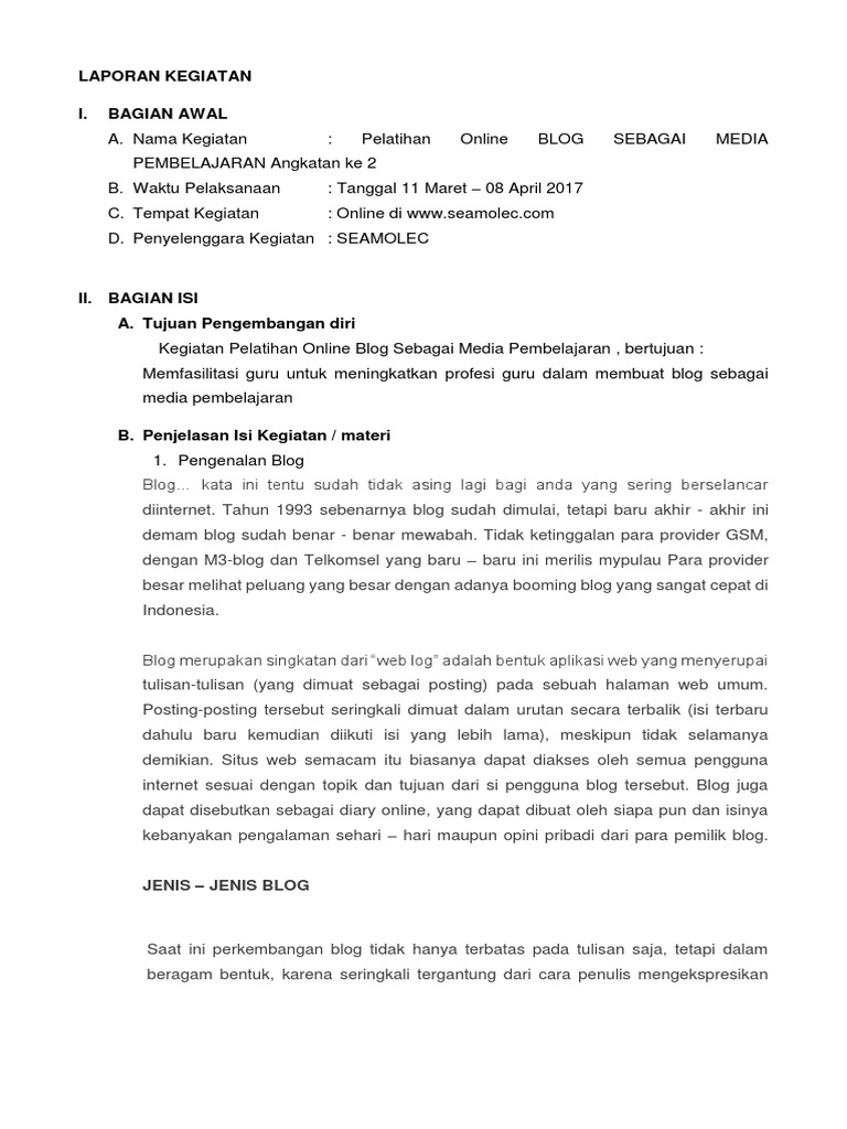Contoh laporan kegiatan pelatihan guru doc. Selama pandemi covid 19 guru dan peserta didik menyelenggarakan pembelajaran secara daring sesuai instruksi mendikbud. 7 contoh laporan kuliah penelitian kegiatan dan. Selanjutnya hasil pembelajaran tersebut dilaporkan guru dalam bentuk laporan. Kelengkapan diklat yang dijadikan bahan penilaian adalah surat tugas asli foto kopi sertifikat diklat yang dilegalisir dan laporan diklat yang asli. Bagi rekan pendidik yang sedang mencari refereni bentuk atau format laporan work from home jenjang smp disini kami akan berbagi contoh laporan kegiatan belajar di rumah daring jenjang smp. Related posts to contoh laporan kegiatan wisuda doc contoh laporan kegiatan wisuda doc 2019 09 09t231400 0700 rating.