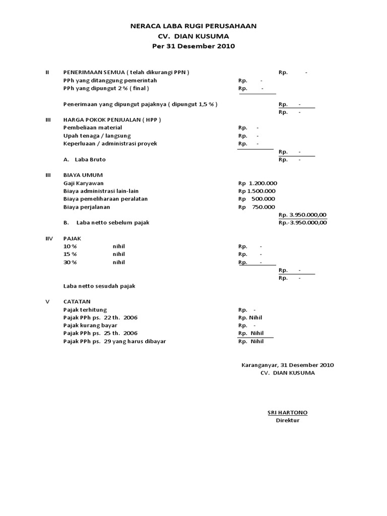 Begitulah yang dapat admin bagikan terkait contoh neraca dan laporan laba rugi cv nihil. Dalam praktiknya fungsi laporan keuangan adalah untuk dijadikan dasar bagi pihak manajemen dalam membuat keputusan strategis. Atau bisa jadi ada kegiatan tetapi setelah dihitung hitung ternyata pajak kurang bayarnya menjadi rp0. Download rpp silabus prota prosem kkm skkd ktsp 2006 sd kelas 5. Berikut ini adalah download rpp silabus prota prosem kkm skkd ktsp 2006 sd kelas 5 yang merupakan kumpulan file dari berbagi sumber documentktsp 2006ktsp sdrpp silabus tentang contoh laporan laba rugi cv nihil. Pada laporan keuangan yang dibuat oleh penulis dapat disimpulkan bahwa.