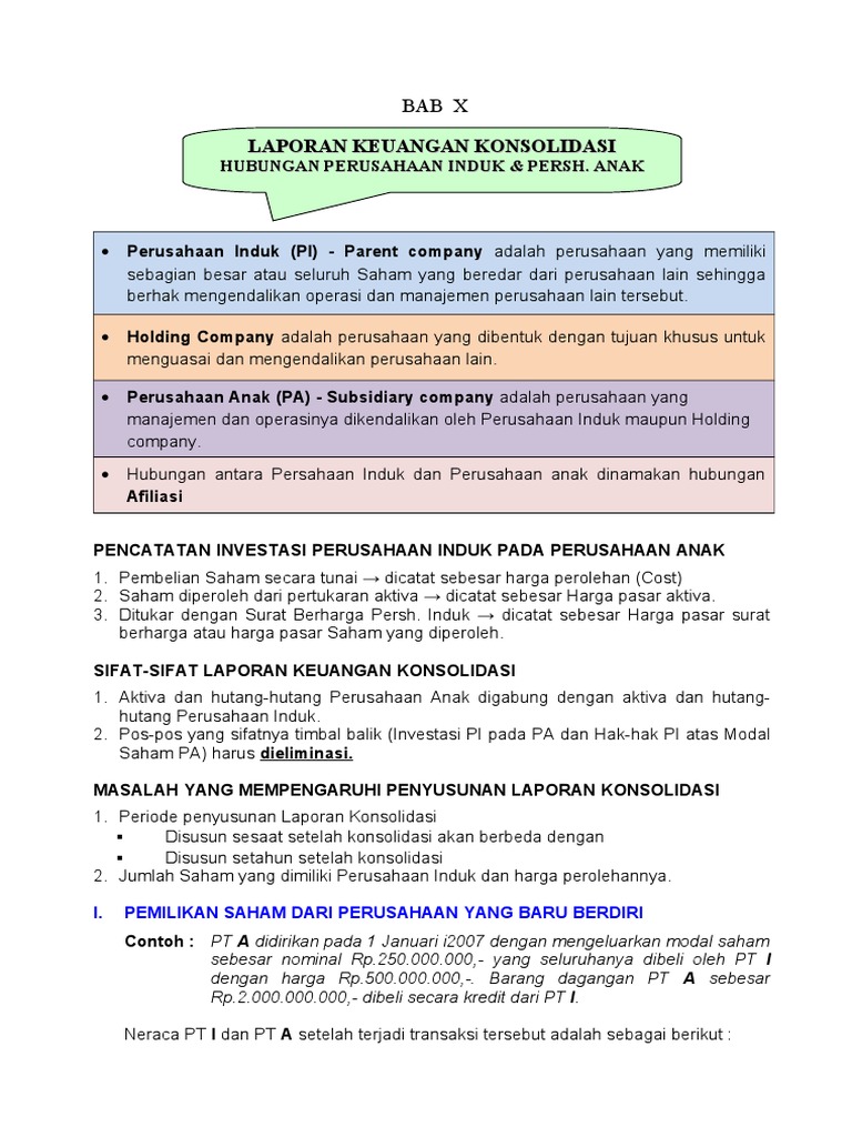Contoh laporan keuangan konsolidasi induk dan anak perusahaan. Konsolidasi dalam akuntansi yaitu penggabungan laporan semua aset ekuitas kewajiban dan akun operasional perusahaan induk dan anak perusahaan menjadi satu laporan keuangan. Suatu perusahaan menjadi perusahaan anak ketika perusahaan lain disebut sebagai perusahaan induk memperoleh pengendalian kepemilikan atas saham berhak suara yang bereda. Tumbuhnya istilah dan munculnya sebuah perusahaan kelompok adalah sebuah reaksi atas kebutuhan peningkatan efisiensi ekonomis dalam sebuah kegiatan usaha. Entitas yang baru bertanggung jawab terhadap pemegang saham kreditur perusahaan induk dan pihak pihak lain yang berkepentingan. Konsolidasi dalam sosiologi yang merupakan bentuk penguatan keanggotaan masyarakat dalam kelompok sosial yang terdiri dari berbagai elemen seperti agama etnis status sosial gender dan lain lain. Dari contoh tersebut telkom indonesia dapat disebut sebagai induk perusahaan dan perusahaan yang berada di bawah naungan telkom indonesia disebut sebagai anak perusahaan.