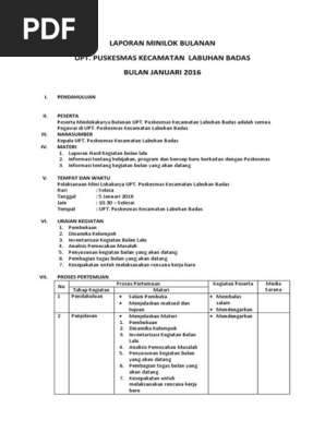 Lokakarya minipertemuan bulanan uptd puskesmas mensiku. 19671228 198801 1 005. Dari proses lokakarya mini baik bulanan maupun tribulanan diharapkan dapat dilakukan pemantauan dan pengendalian pelaksanaan kegiatan puskesmas berdasarkan rencana pelaksanaan kegiatan rpk puskesmas identifikasi permasalahan yang dihadapi selanjutnya dilakukan rumusan pemecahannya sehingga dapat dilakukan perbaikan rencana kegiatan untuk periode berikutnya secara berkesinambungan. Penerapan manajemen penggerakan pelaksanaan dalam bentuk forum pertemuan yang. Demikian laporan loka karya mini bulanan puskesmas mamsena bulan juli tahun 2011 ini dibuat dan digunakan sebagai acuan untuk pelaksanaan kegiatan selanjutnya. Masukan l 2 3 4.