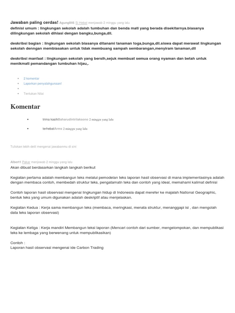 Contoh laporan observasi lingkungan sekolah. 23 bandung ini adalah salah satu sekolah yang memiliki kondisi lingkungan sehat dan bersih karena sekolah ini memiliki 2 jenis lingkungan yaitu lingkungan hidup atau benda hidup yang disebut juga biotik dan lingkungan mati atau benda mati yang sering disebut dengan. Mudah mudahan artikel blog ptk dan model pembelajaran kali ini dapat bermanfaat buat anda. Teks laporan adalah teks yang berisi penjabaran umummelaporkan sesuatu berupa hasil dari pengamatan observasi. Sindanggalih kelurahan kahuripan kecamatan tawang kota tasikmalaya. Sedangkan untuk teks hasil observasinya mempunyai pengertian isi teks yang menjelaskan tentang suatu informasi baik itu hewan tanaman fenomena alam hasil karya manusia serta fenomena sosial yang sesuai. Di bawah ini selain memberikan contoh lembar observasi aktivitas belajar siswa kami juga akan menjelaskan bagaimana proses pembuatannya sehingga diharapkan apabila anda ingin memodifikasi lembar observasi penelitian.