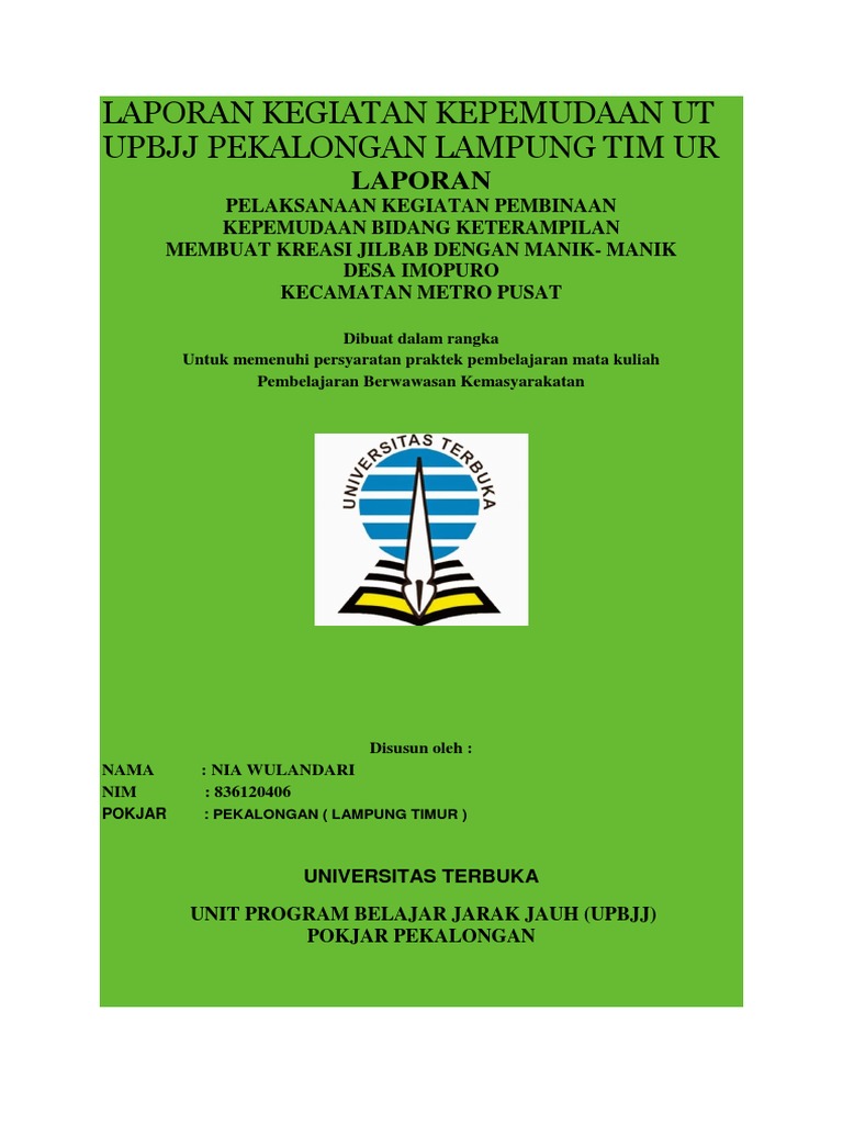 Contoh laporan pembelajaran berwawasan kemasyarakatan tentang kepemudaan. Tugas praktek ini adalah untuk memenuhi syarat dalam penyerahan laporan praktek mata kuliah pembelajaran berwawasan kemasyarakatan. Ucapan terima kasih kepada dosen pembimbing bapak eddy noviana m. Alhamdulilahirobbil alamin puji syukur kehadirat allah swt yang telah memberikan nikmat kesehatan dan ilmu kepada penulis sehingga penulis dapat menyelesaikan laporan mata kuliah pembelajaran berwawasan kemasyarakatan tepat pada waktunyapenulis mengucapkan terima kasih kepada semua pihak yang telah membantu dalam penyelesaian laporan ini. Penyusunan laporan praktik pembinaan kepemudaan ini selain sebagai tugas wajib yang harus diselesaikan sebagai syarat dalam mengikuti mata kuliah pembelajaran berwawasan. Laporan ini dibuat sebagai salah satu syarat untuk memenuhi mata kuliah pembelajaran berwawasan kemasyarakatan program s1 pgsd universitas terbuka upbjj semarang. Penyusunan laporan ini sebagai tugas mata kuliah pembelajaran berwawasan kemasyarakatan pada semester vii.