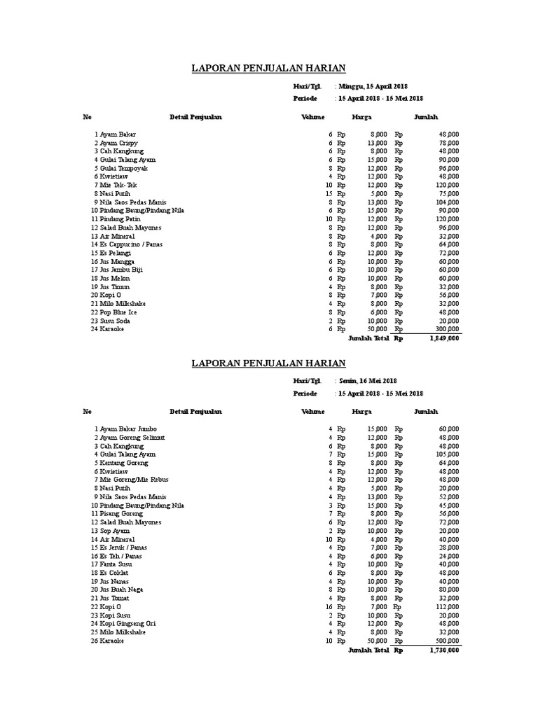 Misalnya sales report dashboard untuk menganlisa laporan penjualan tahun 2012 sampai 2017 dengan beberapa kategori seperti lokasi warehouse dan produk. 12 tujuan tujuan usaha ini bukan hanya mencari profit semata melainkan juga mencari penekanan kepada pengalaman sebuah proses wirausaha karena melalui pemasaran dan penjualan ini kami dituntut untuk berinteraksi dengan orang banyak bagaimana cara menawarkan dengan baik dan sopan meyakinkan pembeli untuk membeli produk minuman yang kita tawarkan dan memberi penjelasan dan pelayanan terbaik. Membuat data pemasukan dan pengeluaran harian di excel. Pantau penjualan harian dan inventaris anda dengan templat yang apik ini. Temukan informasi lengkap tentang cara membuat laporan penjualan harian dengan excel. Dan penyusunan laporan keuangan membutuhkan beberapa laporan lain termasuk membuat laporan penjualan sebagai bagian dari isi yang kemudian tersaji dalam satu laporan keuangan.