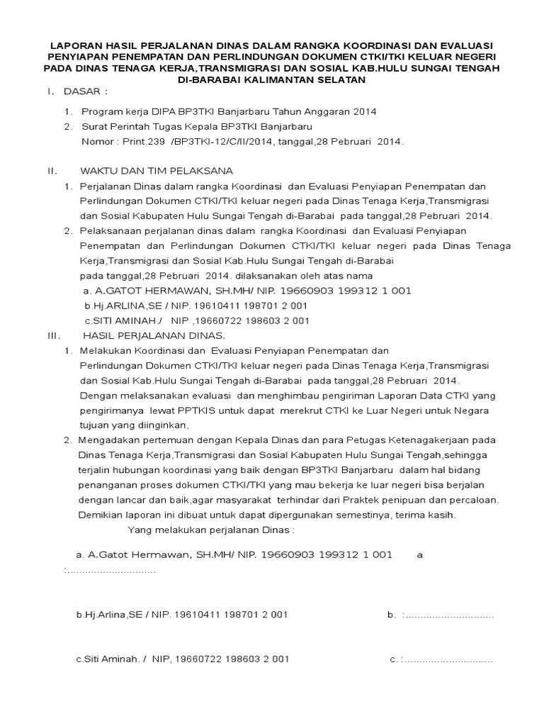 Smp negeri 1 arut selatan 3. Mahkuto romo sesuai dengan peraturan yang berlaku. Semua biaya perjalanan dinas konsumsi dan akomodasi selama melakukan perjalanan dinas menjadi tanggung jawab pt. Contoh laporan perjalanan dinas menghadiri undangan rapat lingkup kementerian lembaga pelaksanaan tugas oleh pegawai seyogyanya dilakukan dengan profesional dan harus dipertanggung jawabkan pada atasan yang telah meberi tugas. Bagi anda yang sedang mencari contoh laporan yang baik dan benar lanjutkanlah membaca artikel ini hingga akhir. Laporan hasil perjalanan dinas dalam rangka koordinasi dan evaluasi penyiapan penempatan dan perlindungan dokumen ctkitki keluar negeri pada dinas tenaga kerjatransmigrasi dan sosial kabhulu sungai tengah di barabai kalimantan selatan i.